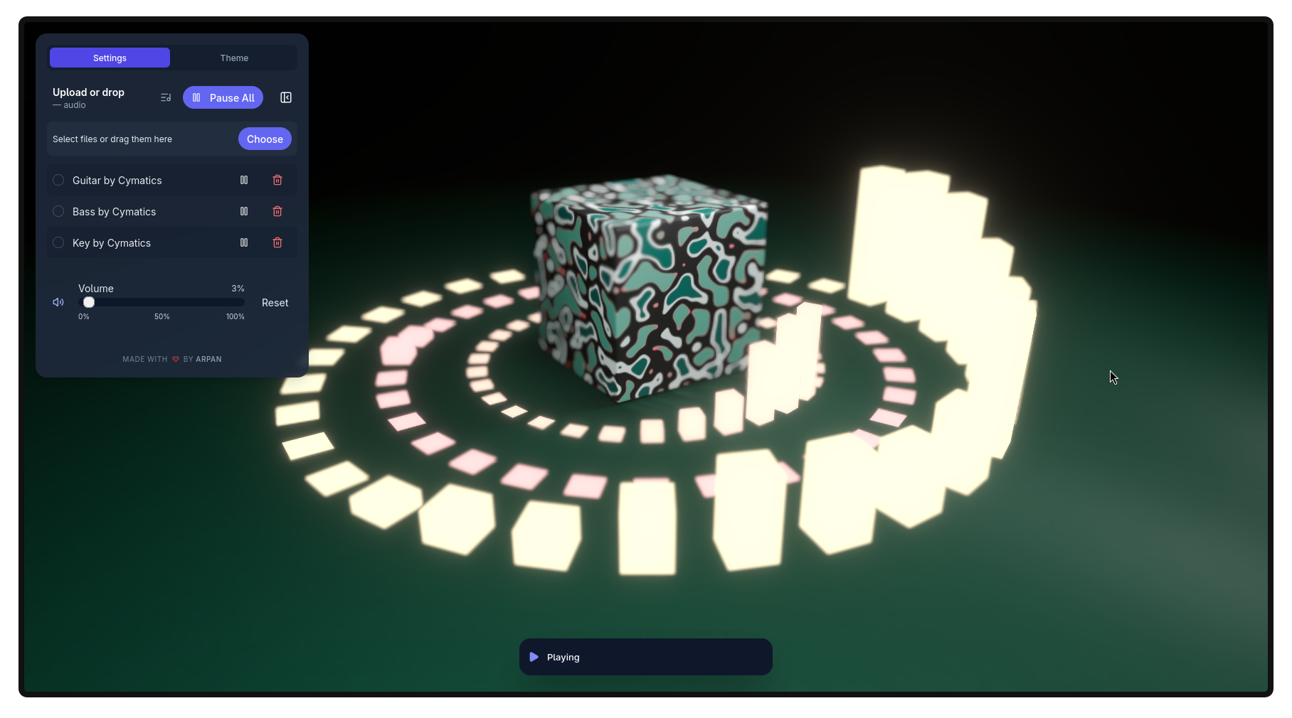 Interactive audio-reactive 3D visualizer built with React, ThreeJs, and React Three Fiber, featuring custom Blender assets, playlist mode, real-time controls, and user-uploaded audio support. A built-in ⚙️ settings panel allows users to upload their own music and customize the experience in real time. The visualizer also ships with default audio presets by Cymatics, making it instantly playable out of the box. This project served as a hands-on deep dive into real-time rendering, performance optimization, audio-visual synchronization, and interactive 3D design on the web.